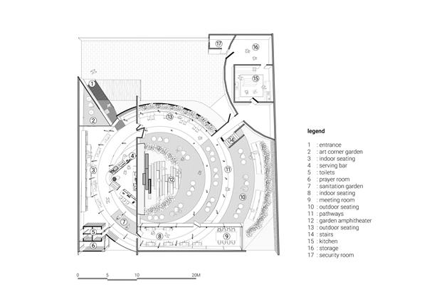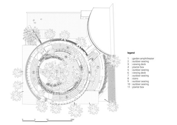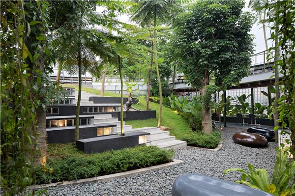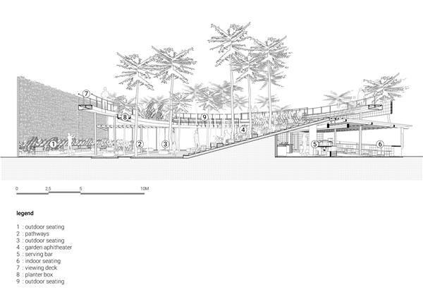 Tanatap环形花园咖啡厅 / RAD+ar_3800398Tanatap环形花园咖啡厅 / RAD+ar,玻璃砖建筑设计,商业建筑设计,咖啡厅,咖啡馆,餐饮空间设计,玻璃砖建筑设计,商业建筑设计,咖啡厅,咖啡馆,餐饮空间设计Tanatap环形花园咖啡店是微缩版的多层次绿化空间,其起落平台构成可以行走的屋顶露台。屋顶露台相连成漂浮的圆形剧场,围绕着中间的绿化空间和热带户外活动区。玻璃砖是围护结构的主要材料,它模糊了建筑和花园,保护了内部隐私,同时透过充足的自然光。墙壁结构被整合在玻璃砖中,从而确保其轻盈性,这带给人一种沉重的材料漂浮在花园上方的感觉,并且这种感觉会随着走进空间而逐渐消散。设计单位:RAD+ar项目地点:印度尼西亚 雅加达项目规模:750㎡完成时间:2021年来源:RAD+ar
